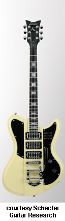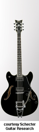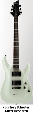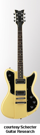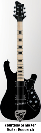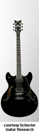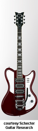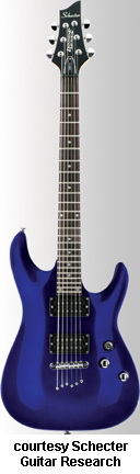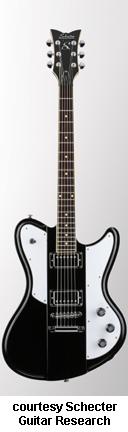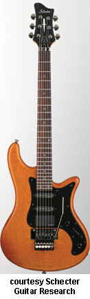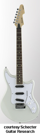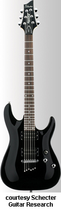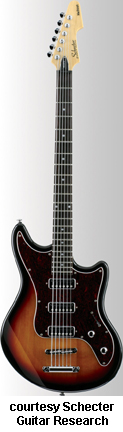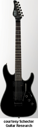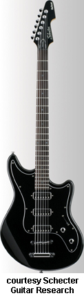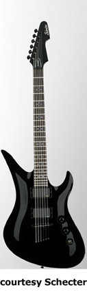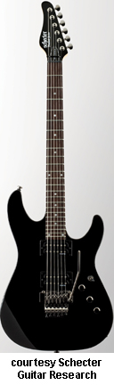 SUNSET DELUXE | - offset double cutaway Strat-style basswood body, bolt-on maple neck, 24-fret rosewood fingerboard with pearl dot inlays, reverse headstock with matching finish overlay, six-on-the-other-side tuners, double locking Floyd Rose licensed tremolo bridge, two Schecter Diamond Plus pickups, three knobs (two v, tone), three-way pickup switch, black chrome hardware, available in Gloss Black finish, 25.5 in. scale, new 2008. |