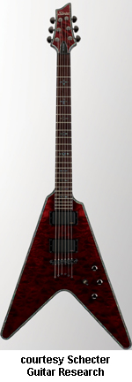 V-1 HELLRAISER | - Flying V-style mahogany body, quilted maple top (Black Cherry finish only), abalone top purfling, set three-piece mahogany neck, 24-fret rosewood fingerboard with gothic cross inlays, abalone purfling matching finish headstock overlay, three-per-side Grover tuners, TonePros tune-o-matic bridge, STB, two EMG-81 active pickups, three knobs (two v, tone with coil tap), three-way pickup switch, black chrome hardware, available in Black Cherry or Gloss Black finish, 25.5 in. scale, new 2008. |