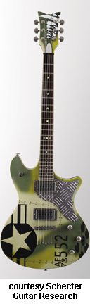 AVIATION MODELS | - PT (Bottoms Up, Bomber Girl, Flying Tiger), S (RAF Spitfire), Tempest (Midway), or Ultra (P-51) body style, mahogany body, mahogany neck, 22-fret rosewood fingerboard with Stars and Bars inlays, Duncan Designed H/S pickup configuration, two knobs, three-way switch, PT-H bridge, six-on-one-side, 2/4-per-side, or three-per-side tuners, available in either Bomber Girl, Bottoms Up, Flying Tiger, Midway, P-51, RAF Spitfire, Tempest A-10 Warthog, or Ultra F-117 Stealth finish, mfg. 2004-07. |