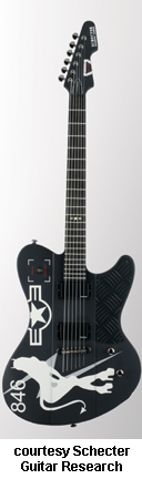 SCORPION | - double cutaway mahogany body, tuned B-B, maple set neck with rosewood fingerboard, diamond position marker at the 12th fret, 24 jumbo frets, three-per-side tuners, black hardware, two Duncan Designed humbucker pickups, available in Black Satin finish, 25.5 in. scale, disc. 2005. |