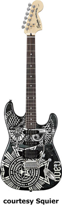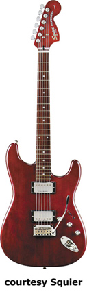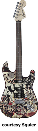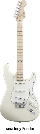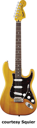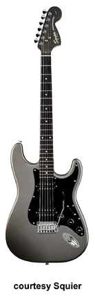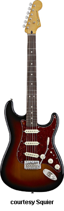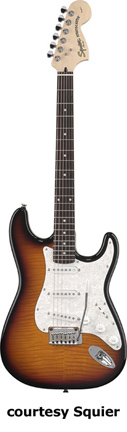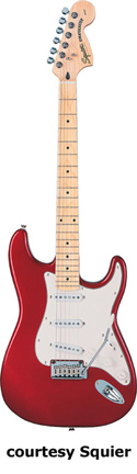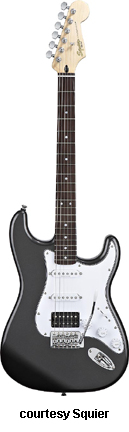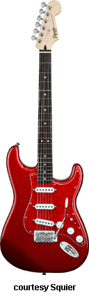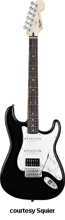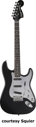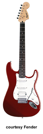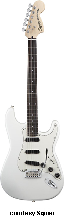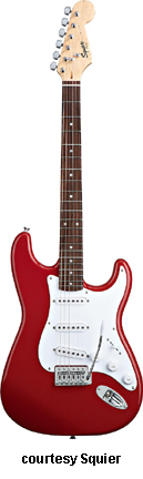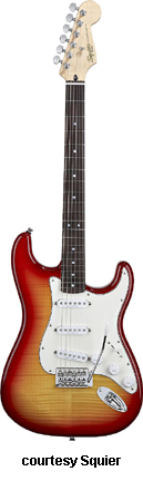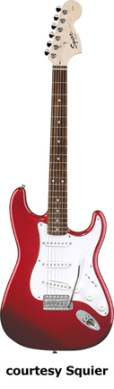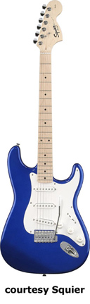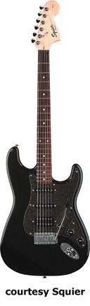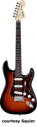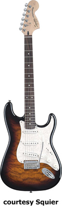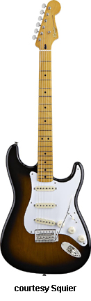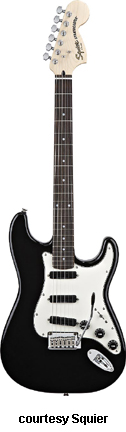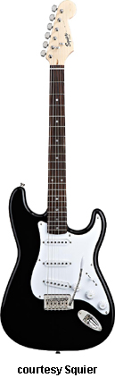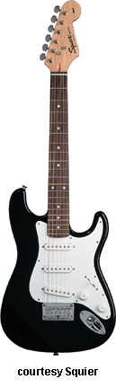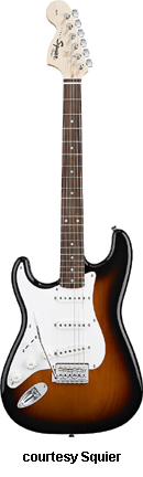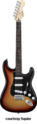 SQUIER | ELECTRIC: STRATOCASTER SERIES | The following models are based on Fender's Stratocaster design. A Squier "Stop Dreaming, Start Playing" guitar/amp pack (MSR $400) is available with a Squier SE Special guitar (available in Arctic White, Black, or Sunburst finish), Squier SP-10 guitar amp, gig bag, tuner, picks, strap, guitar stand, and instructional DVD. | AFFINITY STRAT (NO. 033-0600/031-0600/0602) | - offset double cutaway hardwood body, 22-fret maple fingerboard with black dot inlays (0602) or rosewood fingerboard with white dot inlays (0600), tremolo, chrome hardware, white pickguard, three single coil pickups, three knobs (v, two tone), five-way switch, available in 2-Tone Sunburst (2004-present), Arctic White (disc. 2003), Aztec Gold (2003 only), Baltic Blue (disc. 2003), Black, British Racing Green (disc. 2003), Galactic Purple (2001-02), Metallic Blue (2004-present), Metallic Red (2004-present), or Torino Red (disc. 2003) finish, current mfg. |
