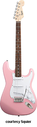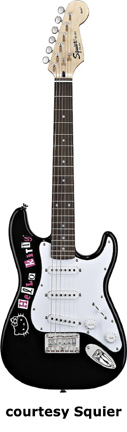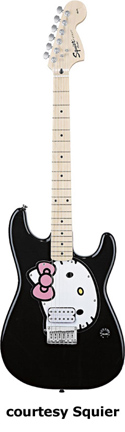 HELLO KITTY STRAT (NO. 033-5005) | - Affinity Series style, agathis body, bolt-on maple C-shaped neck, 21-fret maple fingerboard with pink or black dot inlays, large headstock, hardtail STB bridge, white Hello Kitty pickguard, one humbucker pickup, one volume knob, chrome hardware, available in Black or Pink finish, Hello Kitty artwork on back of guitar, 25.5 in. scale, mfg. 2006-present. |