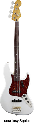 CLASSIC VIBE JAZZ BASS '60S (NO. 030-3075) | - offset double cutaway Jazz Bass-style basswood body based on a 1960s Jazz Bass, bolt-on modern C-shaped maple neck, 21-fret rosewood fingerboard with white dot inlays, Jazz Bass-style headstock, four-on-one-side tuners, four-saddle HiMass bridge, three-ply tortoise pickguard with thumb rest, two Custom Jazz Bass single coil pickups, three black knobs (two v, tone) and an output jack mounted on a chrome plate, chrome hardware, available in Olympic White finish, 34 in. scale, mfg. summer 2008-present. |