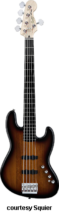 DELUXE JAZZ BASS V ACTIVE FIVE-STRING (INDONSIA MFG. NO. 030-0575) | - offset double cutaway Jazz-style basswood body, bolt-on maple neck, 20-fret rosewood fingerboard with no inlays, matching finish headstock (except Sunburst finish) with 4/1-per-side tuners, five-saddle bridge, no pickguard, two J-style pickups, four knobs (v, blend, two knobs for EQ one is concentric), slap mini switch, active electronics, chrome hardware, available in 3-Tone Sunburst, Black, or Olympic White finish, 34 in. scale, mfg. 2007-present. |
