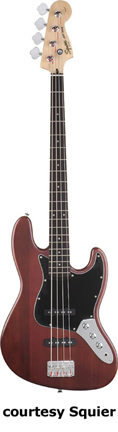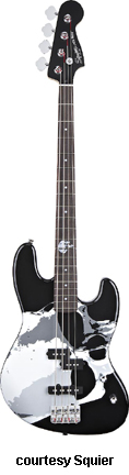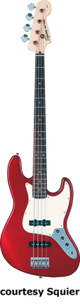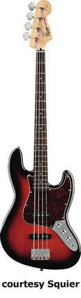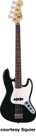 AFFINITY J BASS (NO. 031-0760) | - offset double cutaway alder body, bolt-on maple neck, 20-fret rosewood fingerboard with dot markers, four-on-one-side tuners, four-saddle bridge, three-ply white pickguard, two J-style pickups, three knobs (two v, tone), chrome hardware, available in Black, Metallic Blue, or Metallic Red finish, 34 in. scale, mfg. 2004-present. |