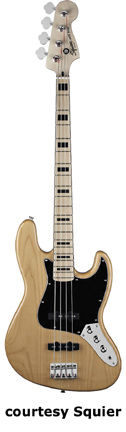 VINTAGE MODIFIED JAZZ BASS (NO. 032-6702) | - soft maple body, bolt-on C-shaped maple neck, 20-fret black bound maple fingerboard with black block inlays, four-on-one-side tuners, standard four-saddle bridge, three-ply black/white/black pickguard, two Duncan Designed J-style single coil pickups, three Knurled chrome dome knobs (two v, tone) mounted on a chrome plate, chrome hardware, available in Natural finish, 34 in. scale, mfg. summer 2006-present. |