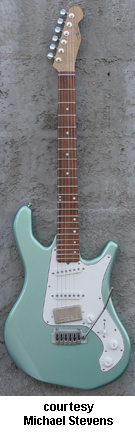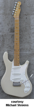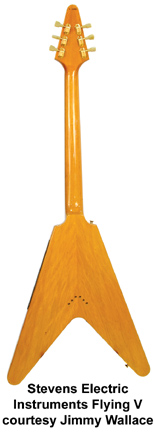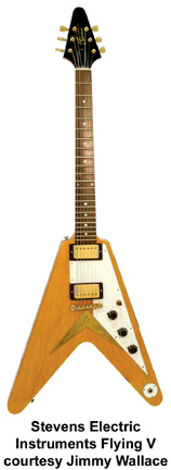 FETISH | - Flying V, Explorer, or Moderne-styel one or two-piece korina body, one-piece quarter-sawn korina neck, 22-fret Brazilian rosewood fingerboard with plastic dot inlays, appropriate pearl or plastic Stevens logo, vintage-style tuners, Pigtail ABR1-style bridge, stop bar or brass tailpiece (dicated by model), four-ply pickguard, two Tom Holmes humbucker pickups, three knobs (two v, tone), three-way pickup switch, gold or nickel hardware, available in Natural Korina finish with vintage tint and nitrocellulose lacquer, 25.625 in. scale, case included, current mfg. |