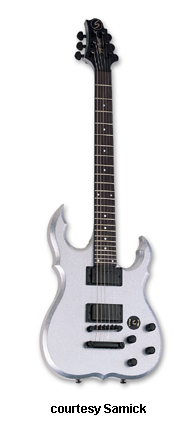 - offset double highly sculpted body with numerous points, set mahogany neck, 24-fret rosewood fingerboard with dot inlay, three-per-side tuners, adjustable bridge, stop tailpiece, two Duncan design humbucker pickups, four knobs, three-way switch, black hardware, available in Black, Metallic Silver, or Metallic Red finishes, mfg. 2004-present. |