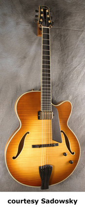 SADOWSKY | ELECTRIC ARCHTOP | A semi-hollow archtop guitar will be available soon ($3,495). | JIM HALL MODEL | - single cutaway archtop hollow body, five-ply premium flame maple top/back/sides, bound body, two bound f-holes, dovetail neck joint, maple neck, ebony fingerboard, three-per-side tuners, adj. ebony bridge, custom designed Sadowsky ebony tailpiece with string ground, raised ebony pickguard, custom hand-wound covered humbucker pickup, two knobs (v, tone), gold hardware, available in Carmel Sunburst, Sienna Sunburst, Vintage Amber, or Violin Sunburst finish, 24.75 in. scale, current mfg. |