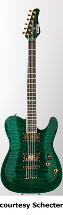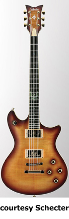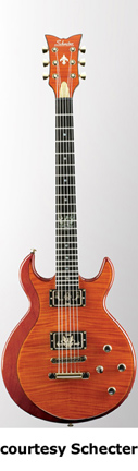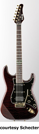 TRADITIONAL 30TH ANNIVERSARY | - offset double cutaway Strat-style swamp ash body, figured maple top, flame maple neck, 22-fret creme bound rosewood fingerboard with pearl dots and 12th fret 30th Anniversary logo inlays, matching headstock with six-on-one-side Sperzel locking tuners, Wilkinson tremolo bridge/tailpiece, black pickguard, two Schecter single coil and one Schecter humbucker pickups HSS, two knobs (v, tone), five-way switch, gold hardware, available in Trans. Mahogany Gloss finish, 25.5 in. scale, mfg. 2006 only. |