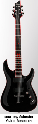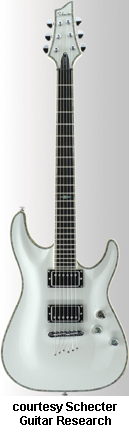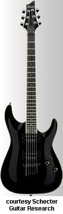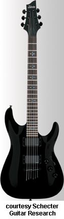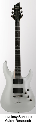 C-7 Hellraiser | - similar to the C-7, except has a mahogany body, three-piece mahogany neck, 24-fret rosewood fingerboard with abalone Gothic Cross inlays, matching headstock, two EMG active pickups, three knobs, three-way switch, available in Black Cherry finish with abalone binding and black chrome hardware, Gloss Black finish with black pearl binding with black hardware, or Gloss White finish with abalone binding and black hardware (new 2008), mfg. 2005-present. |