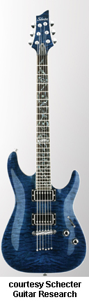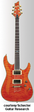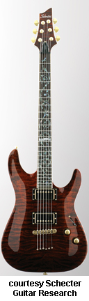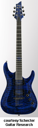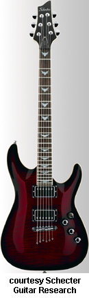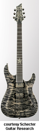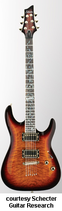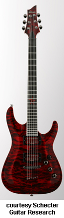 C-1 Hellraiser | - similar to the C-1, except has a mahogany body with quilted maple top, three-piece mahogany neck, 24-fret rosewood fingerboard with abalone Gothic Cross inlays, matching headstock, two EMG active pickups, three knobs, three-way switch, available in Black Cherry finish with abalone binding and black chrome hardware or Gloss Black finish with black pearl binding with black hardware, mfg. 2005-present. |