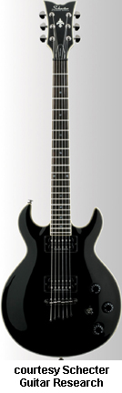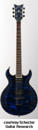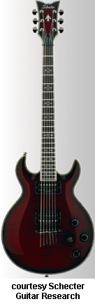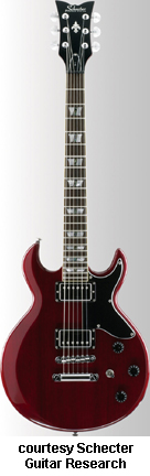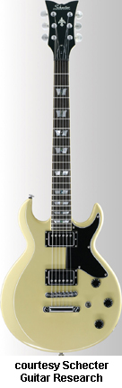 SCHECTER GUITAR RESEARCH | ELECTRIC: DIAMOND S SERIES | | S-1 | - double cutaway mahogany body, bolt-on maple neck, 22-fret rosewood fingerboard with diamond position markers, three-per-side tuners, Grover tuners, two Duncan Designed humbucker pickups, three knobs (two v, tone), three-way pickup switch, chrome hardware, available in Army Green Burst (disc.), Black (disc.), Crimson Burst (disc.), See-Through Cherry, Vintage Ivory, Vintage White (disc.), or Violet Burst (disc.) finish, 24.75 in. scale, disc. 2001, reintroduced 2003-present. |