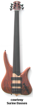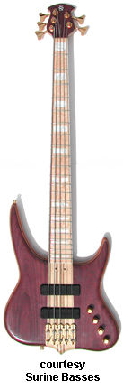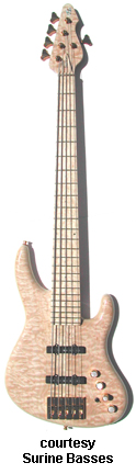 SURINE BASSES | Instruments currently built in Denver, CO since 1992. | Scott M. Surine combined his twenty-five years of bass playing experience with his graphic arts background in design to offer several models of high quality custom basses. Surine, who holds a Bachelor of Arts degree from Arizona State University, works with luthier Kenneth Scott Lofquist (a noted Denver guitar builder) and as of 2005, also shares the luthierie tasks with Kenneth Scott Lofquist. Surine basses have been offered since 1992, and a new series of models were introduced in 2007. Surine basses are owned and played by musicians such as Brent Pearen (Juno Awards), Paulo Roberto Diniz, Jr. (Jota Quest), Lalo Garcia-Maynez (Chuck Berry, Little Richard), Julio Hernandez (Chayanne), David Hyde (Delbert McClinton), Me'Shell NdegeOcello (Maverick Recording Artist), Tiran Porter (Doobie Brothers), Terrynce Rucker (Stylistics), and Reginald Veal (Branford Marsalis). Surine basses are available with custom options such as customer-specified string spacing, neck profile contouring, lined or unlined fretless fingerboards, and left-handed versions at no charge. There is a minimal up charge for other variations such as transparent colors, different electronics packages, and some exotic hardwood caps. Gig bags are included in the price and hardshell cases are available for $200. All Surine basses share the same body construction as neck-through design, double cutaway body that reaches to the 24th fret, Bartolini pickups and NTCTH on-board pre-amp (9-volt), Gotoh tuners, Wilkinson bridge, and double truss rods for five-, six-, and seven-string models (a single truss rod is in the four-string model). For more information visit Surine's website or contact them directly (see Trademark Index). | | ELECTRIC BASS |