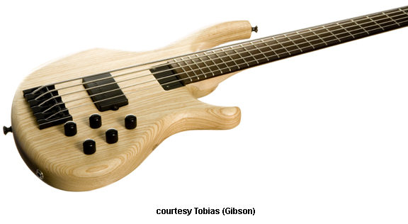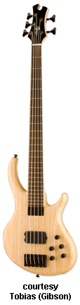 TOBIAS GROWLER (TBG5) | - five-string configuration, offset double cutaway swamp ash body, bolt-on maple/purple heart laminated neck, 24-fret rosewood fingerboard, black headstock overlay with Tobias "T Vine" logo, 3/2-per-side Grover Bass tuners, five-string individual saddle combination bridge/tailpiece, single Bartolini pickup, five black knurled knobs (v, blend, b, m, t), black chrome hardware, available in Natural Satin finish, 34 in. scale, black case included, limited edition run of 350 instruments, new 2009. |