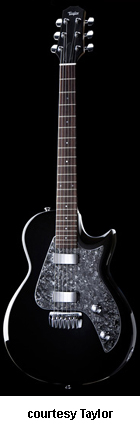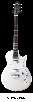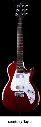 SOLIDBODY CLASSIC | - single cutaway solid swamp ash body, rock maple single bolt T-Lock neck, 22-fret rosewood fingerboard with small pearl dot inlays, ebony headstock overlay with Taylor logo, three-per-side tuners, individual saddle Taylor-designed bridge, crushed pearl pickguard, two Style I 3/4-sized humbucker pickups, two metal knobs (v, tone), five-way pickup switch, chrome hardware, available in Black, Natural, Trans. Red, or Trans. White finish, 24.875 in. scale, deluxe hardshell case included, mfg. 2008-present. |