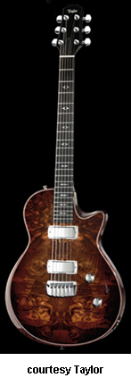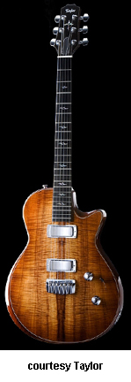 SOLIDBODY CUSTOM | - single cutaway solid swamp sapele chambered body, figured walnut top, ivoroid binding, ivoroid purfling, mahogany single bolt T-Lock neck, 22-fret ebony fingerboard with pinstripe purfling and MOP progressive diamond inlays, ebony headstock overlay with pinstripe purfling and Taylor logo, three-per-side tuners, individual saddle Taylor-designed bridge, crushed pearl pickguard, two Style I 3/4-sized covered humbucker pickups, two metal knobs (v, tone), five-way pickup switch, chrome hardware, available in Natural finish, 24.875 in. scale, deluxe hardshell case included, mfg. 2008-present. |