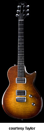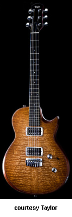 SOLIDBODY STANDARD | - single cutaway solid swamp sapele chambered body, figured Tamo ash top, ivoroid binding, cream purfling, mahogany single bolt T-Lock neck, 22-fret ebony fingerboard with small MOP dot inlays, ebony headstock overlay with Taylor logo, three-per-side tuners, individual saddle Taylor-designed bridge, crushed pearl pickguard, two Style II exposed humbucker pickups, two metal knobs (v, tone), five-way pickup switch, chrome hardware, available in Aged Cherry Sunburst or Natural finish, 24.875 in. scale, deluxe hardshell case included, mfg. 2008-present. |