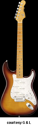 COMANCHE (TRIBUTE SERIES) | - offset double cutaway Stratocaster-style swamp ash body, flamed maple top, bolt on hard rock maple neck, 22-fret maple fingerboard with black dot inlays or rosewood fingerboard with pearl dot inlays, traditional G & L-style headstock, six-on-one-side tuners, G & L Dual Fulcrum vibrato bridge with die-cast saddles, pearl pickguard, three Fullerton-built G & L Magentic Field Design Z-coil pickups, three knobs (v, two tone), five-way pickup switch, PTB passive electronics, mini pickup switch for additional pickup options, chrome hardware, available in Bengal Burst finish, new 2008. |