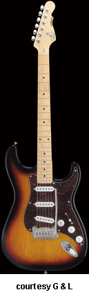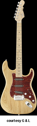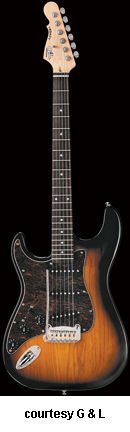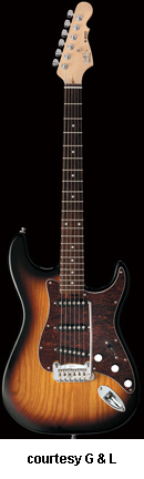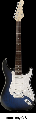 S-500 (TRIBUTE SERIES) | - offset double cutaway Stratocaster-style basswood or swamp ash (Premium finish only) body, bolt on hard rock maple neck, 22-fret maple fingerboard with black dot inlays or rosewood fingerboard with pearl dot inlays, traditional G & L-style headstock, six-on-one-side tuners, G & L Dual Fulcrum vibrato bridge with die-cast saddles, pearl or tortoiseshell pickguard, three Fullerton-built G & L magnetic field single-coil pickups, three knobs (v, two tone), five-way pickup switch, PTB passive electronics, mini toggle switch for additional pickup options, chrome hardware, available in 3-Tone Sunburst, Black, Blueburst, Candy Apple Red (disc.), or Cherryburst (disc.) finish, mfg. 2003-present. |