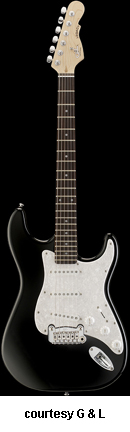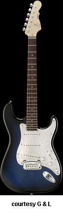 LEGACY (TRIBUTE SERIES) | - offset double cutaway Stratocaster-style basswood or swamp ash (Premium finish only) body, bolt on hard rock maple neck, 22-fret maple fingerboard with black dot inlays or rosewood fingerboard with pearl dot inlays, traditional G & L-style headstock, six-on-one-side tuners, G & L Dual Fulcrum vibrato bridge with die-cast saddles, pearl or tortoiseshell pickguard, three Fullerton-built G & L vintage style Alnico V single-coil pickups, three knobs (v, two tone), five-way pickup switch, PTB passive electronics, chrome hardware, available in 3-Tone Sunburst, Black, or Blueburst finish, mfg. 2003-present. |