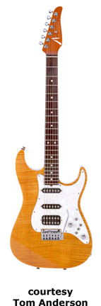 TOM ANDERSON GUITARWORKS | ELECTRIC: DROP TOP SERIES | Tom Anderson introduced the Drop Top model in 1992. The Dropped or bent top feel is the contouring similar to other models, but features a thick top of bookmatched maple or koa. | DROP TOP | - offset double cutaway Strat-style basswood body, bound figured maple top, bolt-on maple neck, 22-fret maple fingerboard with black dot inlay, standard vibrato, six-on-one-side locking tuners, two single coil and one humbucker pickups, volume/tone control, four mini switches, chrome hardware, 25.5 in. scale, mfg. 1991-present. |