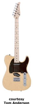 TOM ANDERSON GUITARWORKS | ELECTRIC: HOLLOW T SERIES | The Hollow T series features a swamp ash or basswood body with hollowed out sides and a solid central section (slightly wider than the pickup's width). These hollow internal tone chambers help produce a light weight guitar that still has the tonal characteristics of solid body models. This idea has been offered on other models in the Anderson line as well. | HOLLOW T | - single cutaway swamp ash Tele-style body with two internal hollow sound chambers, bolt-on maple neck, 22-fret maple fingerboard with black dot inlay, fixed bridge, six-on-one-side locking tuners, chrome hardware, two hum-cancelling pickups, volume/tone control, four mini switches, 25.5 in. scale, current mfg. |