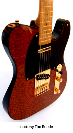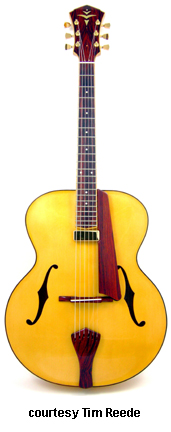 TIM REEDE CUSTOM GUITARS | Instruments currently built in Minneapolis, MN since 2003. Distributed by The American Guitar and Band in Maple Grove, MN and Luthiers Pride in Howell, NJ. | Luthier Tim Reede has been building guitars professionally since 2003. Reede builds unique, one of a kind acoustic, archtop, and electric instruments, and some are created specifically for an individual. Customers can choose the size and features of their guitar to conform to their playing style and aesthetics. Custom designed pearl inlays, woods, and controls for electrics are also available. For more information, visit Reede's website or contact him directly (see Trademark Index). | | ELECTRIC/ELECTRIC ARCHTOP |