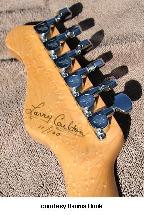 LARRY CARLTON SIGNATURE MODEL | - 7/8 T-style mahogany body, bolt-on bird's-eye maple neck, 24-fret rosewood fingerboard with pearl dot inlays, black headstock overlay, six-on-one-side Gotoh tuners, tune-o-matic bridge, stop tailpiece, black pickguard, two P-100 pickups, two knobs (v, tone), three-way pickup switch, chrome hardware, available in Trans. Cream and possibly other various finishes, 24.75 in. scale, mfg. 1991-92. |