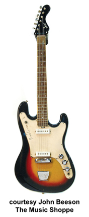 TYPHOON | - similar to the Tornado model, except has a 3+3 headstock, 2 single coil pickups, and the pickup selector switch is located on the upper bass bout, mfg. 1965-67. |