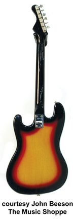 BULLDOG | - offset double cutaway body with beveled ridge along top edge, 3+3 headstock, 3 single coils, chrome hardware, vibrato bridge, volume/2 tone controls, pickup selector switch on lower treble bout, mfg. 1966 only. |
