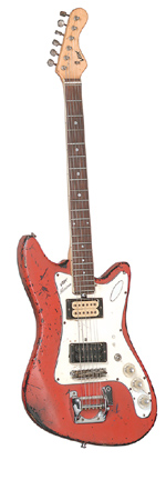 INVADER | - offset Mosrite-styled double cutaway solid body, 6-on-a-side tuners, 22-fret neck with white block inlays, ornate inlaid headstock design, 2 single coil pickups, chrome hardware, Bigsby-styled tremolo, hand operated wah-wah control, 1 volume/2 tone knobs, pickup selector switch, built-in "E" tuner. "On-board" effects mounted on the black pickguard includes a Treble/Bass boost on/off switch and control, Distortion on/off switch and control, "Wah Wah" control, and "Repeat Percussion" (a repeating echo-like function) on/off switch and control, available in Sunburst finish, mfg. 1967-68. |