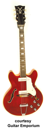 VIPER | - dual cutaway hollowbody, 6-on-a-side headstock, 2 Ferro-Sonic single coil pickups with chrome covers, 21-fret neck with white block inlays, raised black pickguard, 2 f-holes, chrome hardware, trapeze Vox tailpiece, volume/2 tone controls, pickup selector switch, "E tuner" on/off switch mounted on lower treble bout. "On-board" effects mounted on a metal plate features a Treble/Bass boost on/off switch and control, Distortion on/off switch and control, Wah-Wah control, and "Repeat Percussion" (a repeating echo-like function) on/off switch and control, available in Sunburst or Cherry finishes, mfg. 1968 only. |