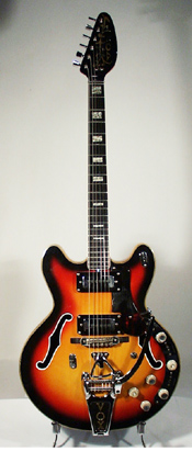 ULTRASONIC | - dual cutaway hollowbody, 6-on-a-side headstock, 2 single coil pickups with chrome covers, 21-fret neck with white block inlays, raised black pickguard, 2 f-holes, chrome hardware, roller bridge/tremolo system, hand operated wah-wah control, volume/2 tone controls, pickup selector switch, "E tuner" on/off switch mounted on lower treble bout. "On-board" effects mounted on a metal plate features a Treble/Bass boost on/off switch and control, Distortion on/off switch and control, Wah-Wah control, and "Repeat Percussion" (a repeating echo-like function) on/off switch and control, available in 6 and 12-string versions, available in Sunburst or Cherry finishes, mfg. 1967-68. |