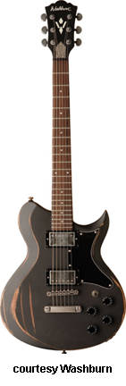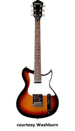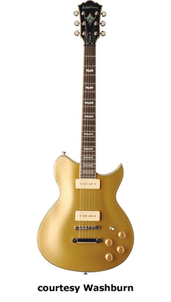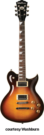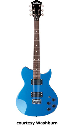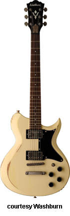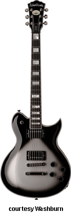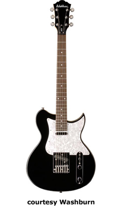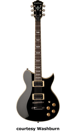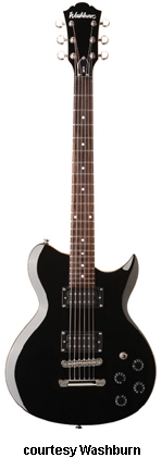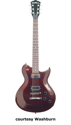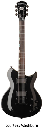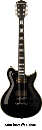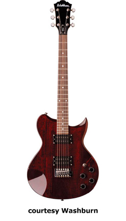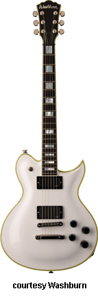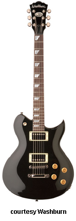 WI15 | - single cutaway Idol-style basswood body, bolt-on maple neck, 22-fret rosewood fingerboard with dot inlays, black headstock overlay, three-per-side tuners, tune-o-matic bridge, stop tailpiece, two Washburn exposed humbucker pickups, four knobs (two v, two tone), three-way pickup switch, chrome hardware, available in Black, Pearl White, or Walnut finish, 24.75 in. scale, new 2008. |