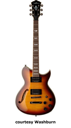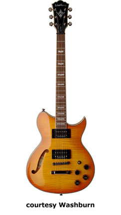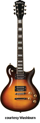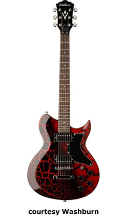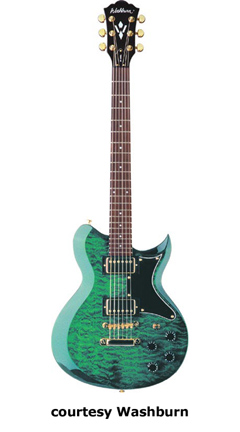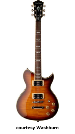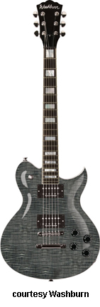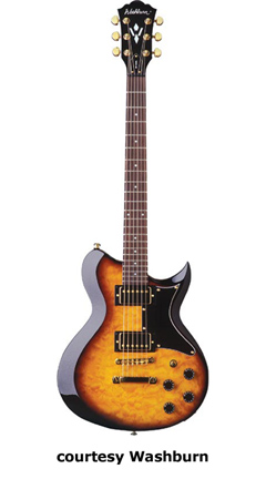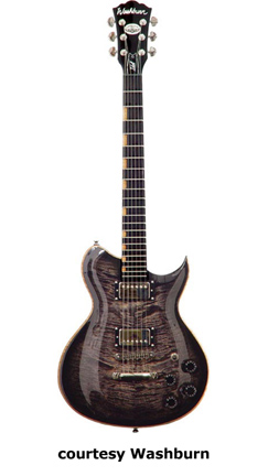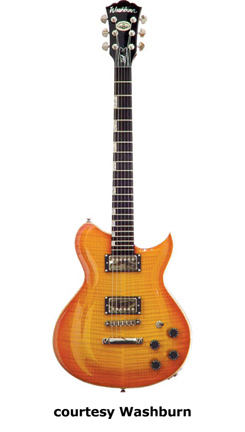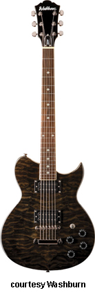 WI18 | - single cutaway Idol-style mahogany body, quilted maple top, set mahogany neck, 22-fret bound rosewood fingerboard with diamond inlays, black headstock overlay, three-per-side tuners, tune-o-matic bridge, stop tailpiece, two Washburn exposed humbucker pickups, four knobs (two v, two tone), three-way pickup switch, chrome hardware, available in Trans. Black or Trans. Red finish, 24.75 in. scale, new 2008. |
