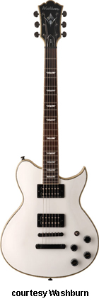 WI566 (USA MFG.) | - single cutaway Idol-style mahogany body, set mahogany neck, 22-fret rosewood fingerboard with side abalone pearl block inlays, black headstock overlay with Washburn logo and Custom Shop USA logo inlay, three-per-side Grover Exclusive tuners, tune-o-matic bridge, Tone Pros stop tailpiece, two EMG pickups (EMG 85 Neck, EMG 81 Bridge), four knobs (two v, two tone), three-way pickup switch, Buzz Feiten Tuning System, black hardware, available in Black or White finish, 24.75 in. scale, case included, new 2008. |