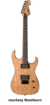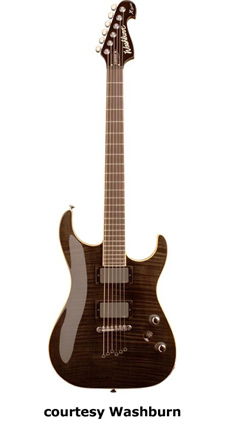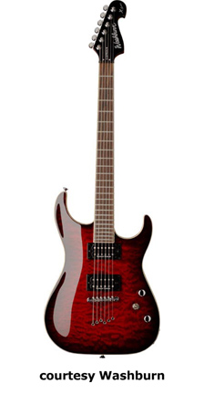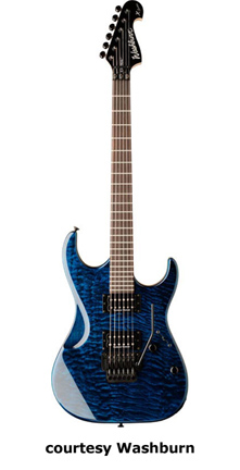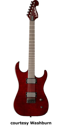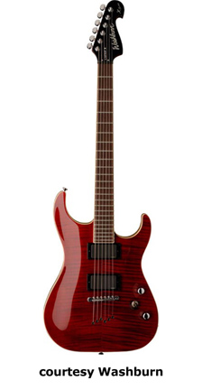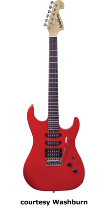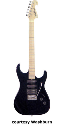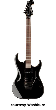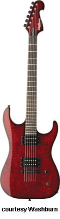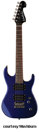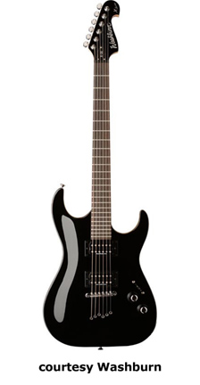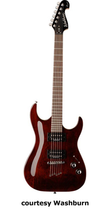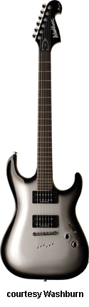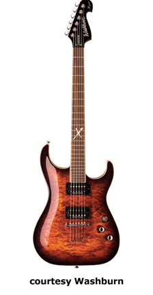 X10 | - offset double cutaway Strat-style solid wood body, bolt-on maple neck, rosewood fingerboard with offset dot inlay, six-on-one-side tuners, Flushtrem bridge, three Washburn pickups in HSS configuration, two knobs, five-way switch, chrome hardware, available in Black, Metallic Blue, Metallic Cherry, or Metallic Gray finish, mfg. 2004-present. |