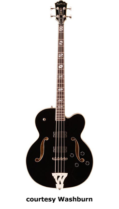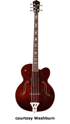 AB 90 | - single smooth cutaway hollow bound body, two bound f-holes, bolt-on bound maple neck, 21-fret rosewood fingerboard with split abalone block inlays, bound headstock with two-per-side tuners, Washburn W tailpiece, two soapbar pickups, four knobs, chrome hardware, available in Walnut or Black finish, mfg. 2004-06. |
