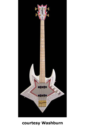 SPACE BASS BOOTSY COLLINS SIGNATURE (U.S. MFG.) | - Bootsy Collins signature, star shaped body with pointed horns, mahogany body with maple top, maple neck, 24-fret birdseye maple fingerboard with pearl star inlays, matching headstock with two-per-side tuners, Bad Ass II bridge, two Seymour Duncan STKJ2 humbucker pickups, four star-shaped knobs, gold hardware, available in Pearl White finish with Swarovski Austrian crystals, mfg. 2002-06. |