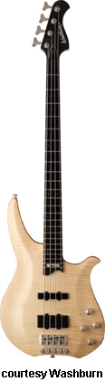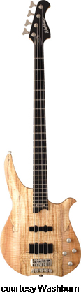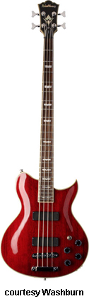 WB66 IDOL BASS | - single cutaway Idol-style mahogany body, carved top, multi-ply body binding, mahogany neck, 24-fret bound rosewood fingerboard with pearl notched trapezoid inlays, bound headstock with floral inlays, two-per-side tuners, tune-o-matic bridge, stop tailpiece, two Egnater soapbar pickups, four numbered knobs (two v, two tone), three-way pickup switch, Buzz Feiten Tuning System, chrome hardware, available in Black or Trans. Red finish, mfg. 2007-present. |