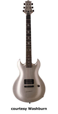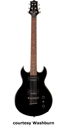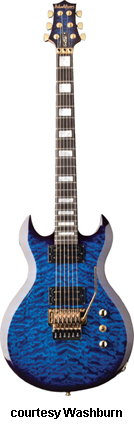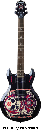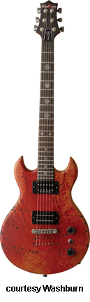 WV540VASI "MURDER WEAPON" (USA MFG.) | - offset Flying V-style solid mahogany body, set mahogany neck, 24-fret carbon glass epoxy composite fingerboard with no inlays, reverse hockey stick-style headstock with matching finish and Washburn logo, six-on-the-other-side Sperzel tuners, original Floyd Rose tremolo bridge, two Seymour Duncan exposed humbucker pickups ('59 Neck, El Diablo bridge), two knobs (v, tone), three-way pickup switch, Buzz Feiten Tuning System, black hardware, available in Blood Red finish, 25.5 in. scale, case included, new 2008. |