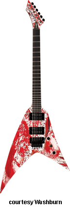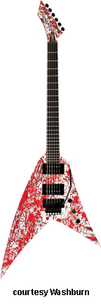 WV40VASI "MURDER WEAPON" | - offset Flying V-style solid mahogany body, set mahogany neck, 24-fret rosewood fingerboard with no inlays, reverse hockey stick-style headstock with matching finish and Washburn logo, six-on-the-other-side Grover Exclusive tuners, licensed Floyd Rose tremolo bridge, two Randall exposed humbucker pickups (UL Neck, Ultra XL bridge), two knobs (v, tone), three-way pickup switch, Buzz Feiten Tuning System, black hardware, available in Blood Red finish, 25.5 in. scale, case included, new 2008. |