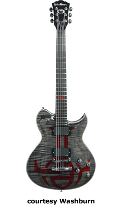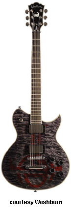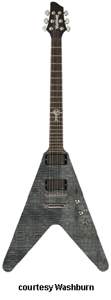 WV66ANC NICK CATANESE | - Flying V-style mahogany body, flame maple top, mahogany set neck, 22-fret rosewood fingerboard with 11th-13th fret Evil Twin inlay, black headstock overlay, with vertical Washburn logo, three-per-side Grover Exclusive tuners, tune-o-matic bridge, stop tailpiece, two EMG pickups (81 Neck, 85 Bridge), two metal knobs (v, tone), three-way pickup switch, Buzz Feiten Tuning System, chrome hardware, available in Trans. Black finish, 24.75 in. scale, new 2008. |