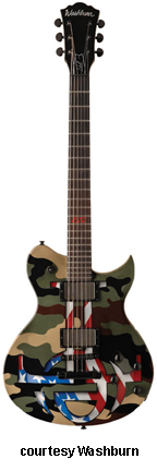 WI64ANC NICK CATANESE | - single sharp cutaway Idol-style mahogany body, mahogany neck, 22-fret rosewood fingerboard with 12th fret red ET inlay, black headstock overlay with Washburn logo and skull inlay, three-per-side Grover Exclusive tuners, tune-o-matic bridge, stop tailpiece, two EMG pickups (81 Neck, 85 Bridge), four knobs (two v, two tone), three-way pickup switch, Buzz Feiten Tuning System, black hardware, available in Camo finish with ET graphics, 24.75 in. scale, new 2008. |