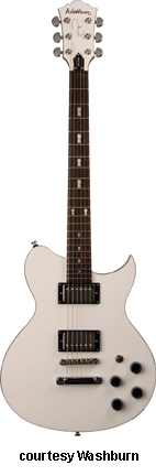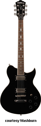WASHBURN | ELECTRIC: MISC. SIGNATURE MODELS | | WI26 JOE TROHMAN | - single cutaway Idol-style mahogany body, single-ply top binding, set mahogany neck, 22-fret bound rosewood fingerboard with key hole inlays, bound headstock with matching finish overlay, Washburn logo, and Joe Trohman signature, three-per-side Grover Exclusive tuners, tune-o-matic bridge, stop tailpiece, two Washburn covered humbucker pickups, four knobs (two v, two tone), three-way pickup switch, Buzz Feiten Tuning System, chrome hardware, available in Black or White finish, 24.75 in. scale, new 2008. |