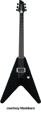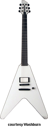 WV66GT GREG TRIBBETT | - Flying V-style mahogany body, single-ply top oppposite color binding, set mahogany neck, 22-fret opposite color-bound ebony fingerboard with no inlays, opposite color bound headstock with matching finish overlay, opposite color truss rod cover, and Washburn logo, three-per-side Grover Exclusive tuners, tune-o-matic bridge, stop tailpiece, single EMG 81 pickup, single volume knob, Buzz Feiten Tuning System, black hardware, available in Black or White finish, 24.75 in. scale, case included, new 2008. |