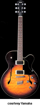 AE 500 | - single smooth cutaway semi-hollow maple body, two custom design f-holes, single-ply body binding, set mahogany neck, 22-fret bound rosewood fingerboard with dot inlays, black headstock overlay with Yamaha logo, three-per-side tuners, Yamaha original design AES bridge, six indivdual string tailpieces, raised bound blackpickguard, two humbucker exposed pickups, four knobs (two v, two tone), three-way switch, chrome hardware, available in Black or Brown Sunburst finish, mfg. 2004-08. |
