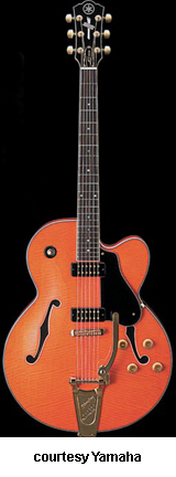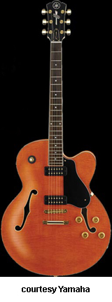 AES 1500 | - single smooth cutaway ES-5-style semi-hollow curly maple body with maple/spruce center block, arched sycamore top, multi-ply body binding, two bound f-holes, set maple neck, 22-fret bound rosewood fingerboard with pearl dot inlays, bound headstock with black overlay, Yamaha logo, and torch inlay, three-per-side tuners, tune-o-matic bridge, stop tailpiece, raised multi-ply black (Orange Stain finish) or white (Pearl Snow White finish) pickguard, two DiMarzio Q-100 humbucker pickups with exposed pole pieces, four knobs (two v, two tone with coil taps), three-way pickup switch, gold hardware, available in Orange Stain or Pearl Snow White finish, 24.75 in. scale, mfg. 1990-present. |