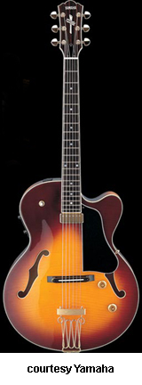 AEX 1500 | - single rounded cutaway hollow maple or sycamore body, arched sycamore top, multi-ply body binding, two bound f-holes, set maple neck, 20-fret bound ebony fingerboard with pearl dot inlays, multi-ply bound headstock with black overlay, and pearl Yamaha logo and torch inlays, three-per-side tuners, adj. ebony-based bone bridge, trapeze tailpiece with scroll wire design, raised bound black pickguard, single floating mini humbucker pickup and a piezo bridge pickup, two knobs (v, tone), three-way pickup switch, three-band EQ/Mix/Mid Freq. piezo controls mounted on the side, gold hardware, available in Antique Stain, Faded Burst, or Natural finish, 25.25 in. scale, mfg. 1995-present. |